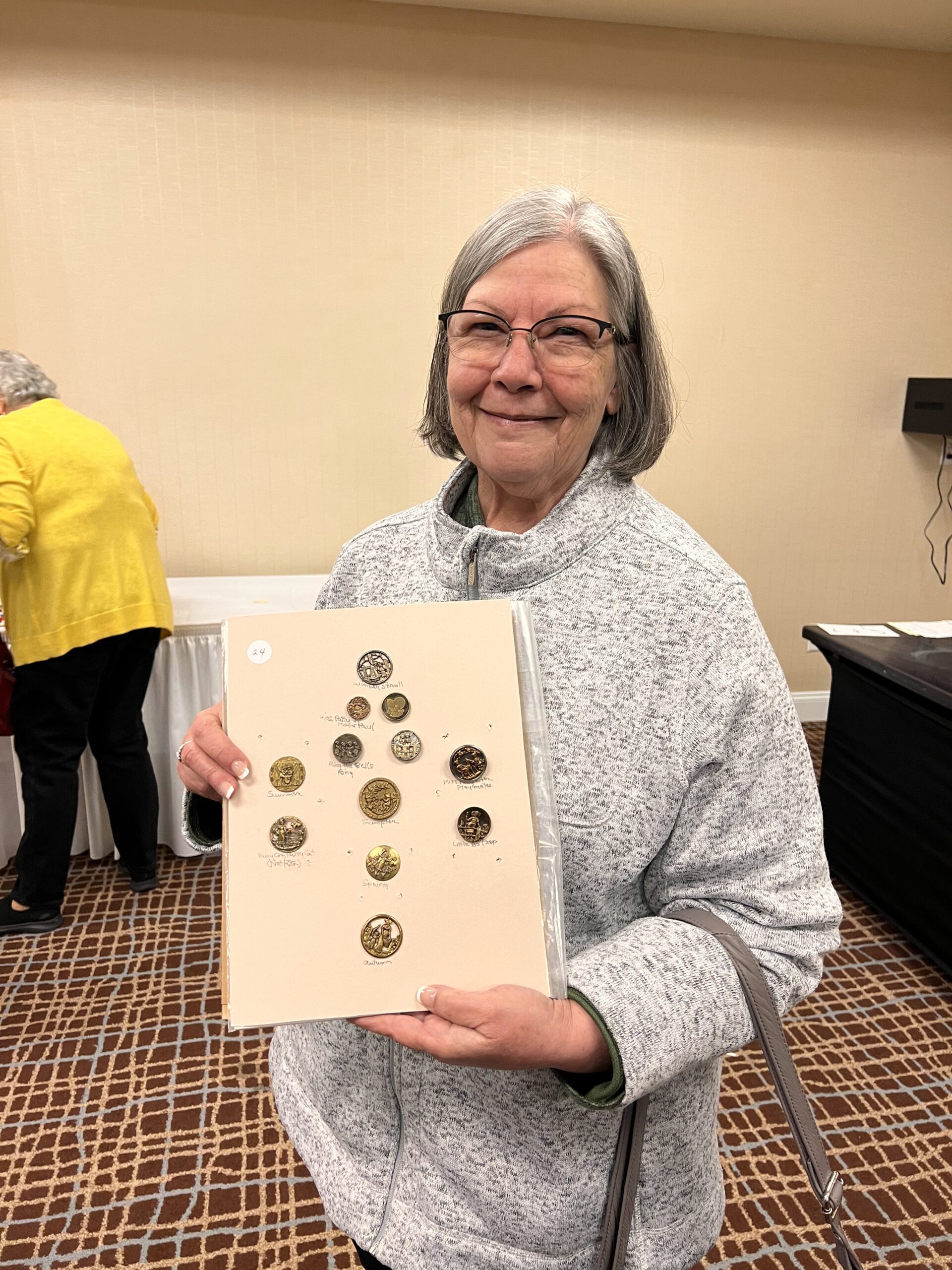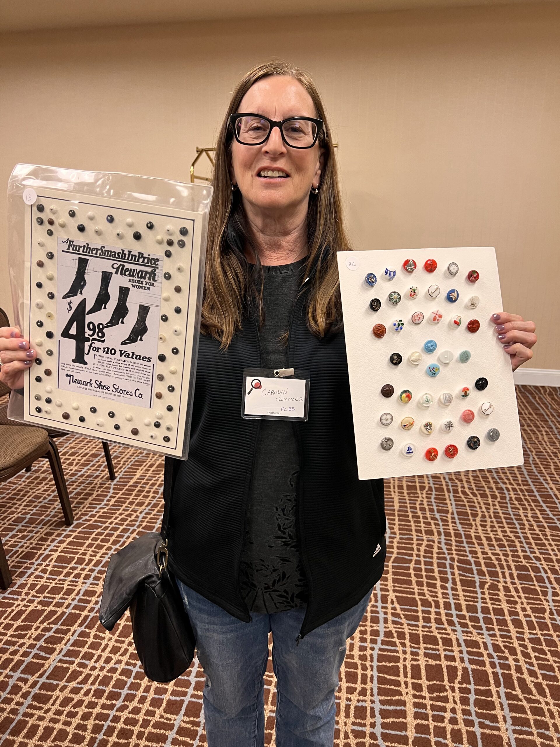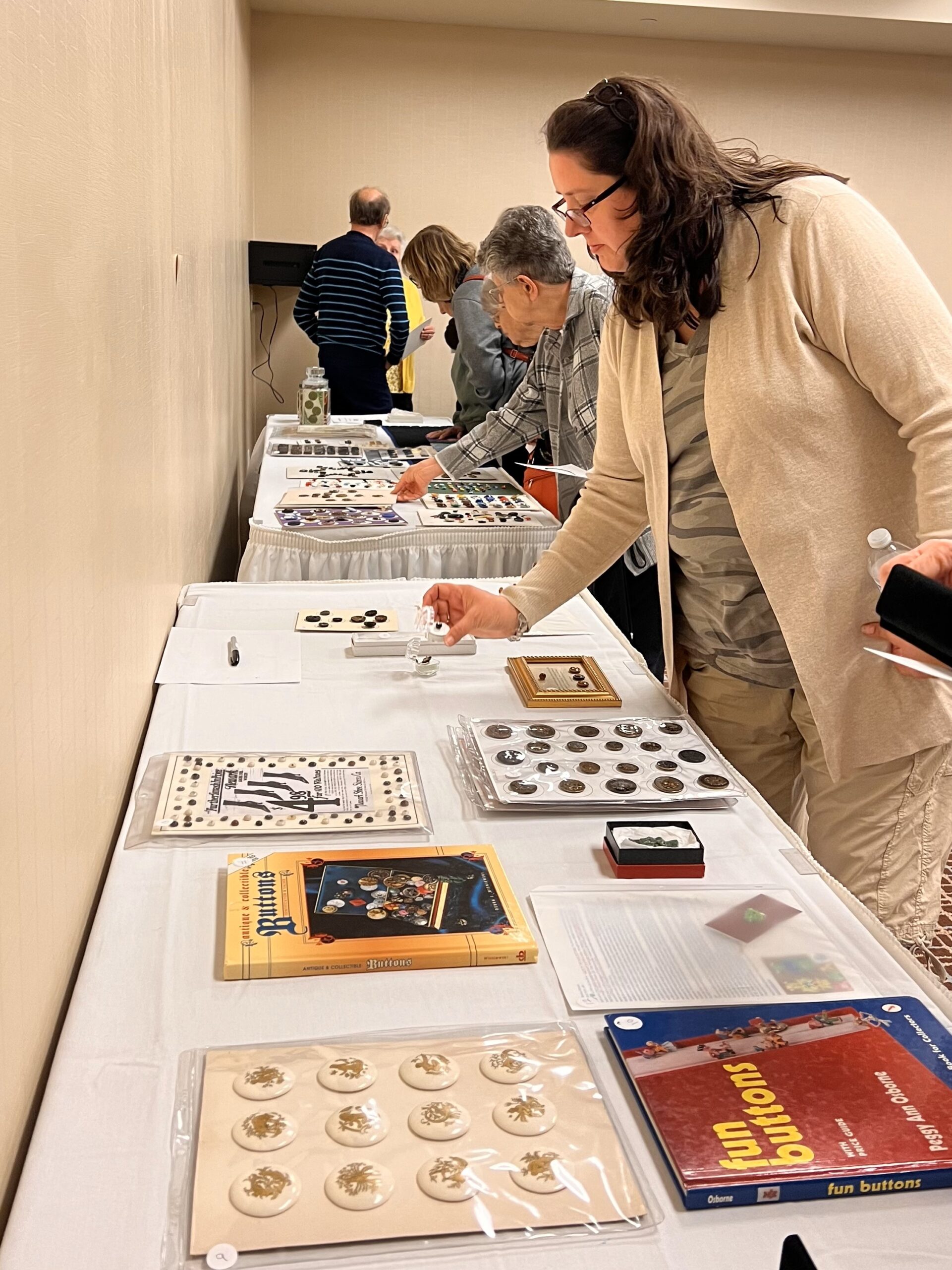 Events included button dealers from across the nation selling buttons, a display of buttons representing the show theme, a button auction, judging of the competitive button trays, and a guest presentation by Sharon Braund and Carolyn Webb where they shared stories about their travels together in search of buttons and shared some of their favorite buttons and button cards.
